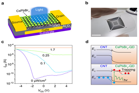 半导体性碳纳米管和无机钙钛矿量子的复合薄膜构成器件的沟道材料。其中,量子点作为感光层和光生电荷俘获层,高纯度半导体性碳纳米管薄膜作为载流子传输层。a、结构示意图;b、柔性人工视觉芯片外观图(标尺,5 mm);c、不同光强下的器件转移特性曲线;d、暗态(上图)与光照(下图)条件下的作用机制