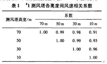 1#测风塔各高度实测风速相关系数见表1,由表1可见,测风塔各高度间风速具有良好的相关性。