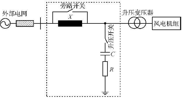 X—限流阻抗,用于限制电压升高对电网及风电场内其他在运行风电机组的影响;在电压升高发生前后,限流阻抗可利用旁路开关短接; C,R—升压阻抗、升压阻尼电阻,闭合升压开关,将升压阻抗和升压阻尼电阻组成的单相支路的三相或两相连接在一起,在测试点产生要求的电压升高