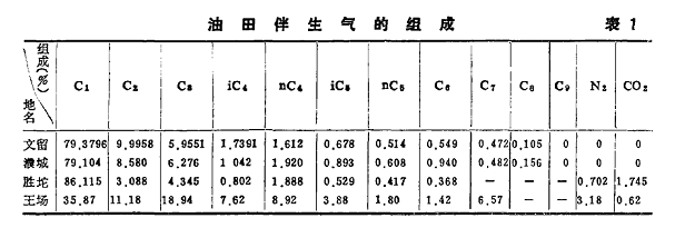 油田伴生气是伴随原有共生,与原油同时采出后在集输、储运过程中从原油中分离出来的天然气,其组分主要是饱和烃,但是随着油藏性质、分离条件等因素的不同,组成上有较大差异。(见表1。)
