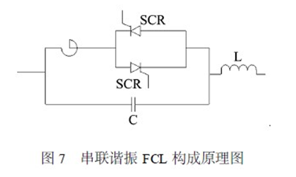 ①串联谐振FCL利用电力电子器件,使正常工作时处于串联谐振(阻抗接近零) 状态下的电路在出现短路故障时脱谐,使阻抗增大而达到限制短路电流的目的。图7为串联谐振FCL构成原理图,正常运行时晶闸管(SCR)不导通,电感L与电容C发生串联谐振,装置阻抗为零。在系统出现短路时,SCR导通,电抗器串入电路起到限流作用。串联谐振FCL简单、可靠,已在中压配电网中获得应用。