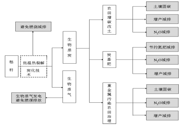 该技术在封闭限氧条件下,将农作物秸秆稍加破碎,于350~550℃下经热裂解产生气体、液体和固体三相物质。其中,固体部分主要是碱性的生物质炭,为基本保持植物细胞结构的富含稳定性碳(70%左右)和芳构化稳定有机质碳,并含有丰富的钾、硅、磷和钙、铁等养分;气体部分为生物质燃气;液体部分为木醋液。生物质炭用于农田,能实现直接储碳,并通过抑制农田N2O排放而起到间接减排的作用。同时,利用生物质炭生产的复合缓释肥用于农田时,还能减少氮肥施用量。
