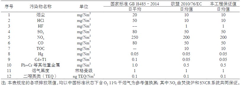烟气净化工艺系统满足中国现有《生活垃圾焚烧污染控制标准》(GB 18586-2014)和欧盟2010/76/EC中较严格的烟气排放标准要求。本工程设计的烟气排放指标如表2所示,以干基、O2含量11%计。