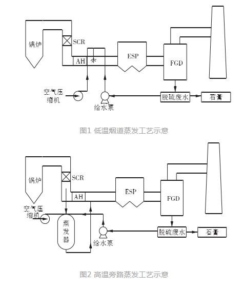 目前火电厂负荷普遍较低,在较低负荷下空预器后烟气温度降低至 110 ℃,难以将废水雾化液滴完全蒸干。为克服该技术这一缺点,高温旁路蒸发技术逐渐受到关注,如图 2 所示。该技术建立独立的高温旁路蒸发器,从 SCR 后空预器前抽取部分300~350 ℃热烟气对废水雾化液滴进行干燥,蒸发器出口接原烟道,蒸发产物盐分等进入除尘器被捕集。高温旁路烟气蒸发技术根据雾化器和蒸发器结构的不同可分为旁路蒸发塔技术和旁路烟道蒸发技术。
