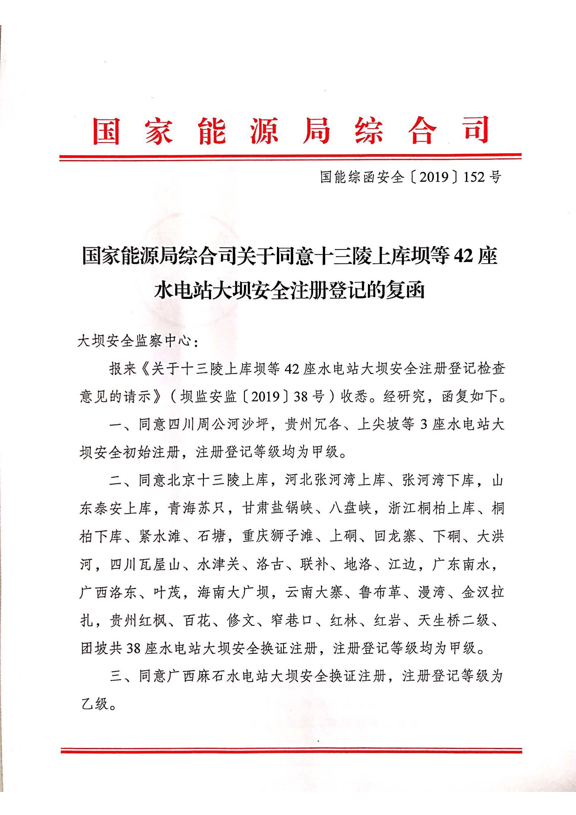 国家能源局综合司关于同意十三陵上库坝等42座水电站大坝安全注册登记的复函